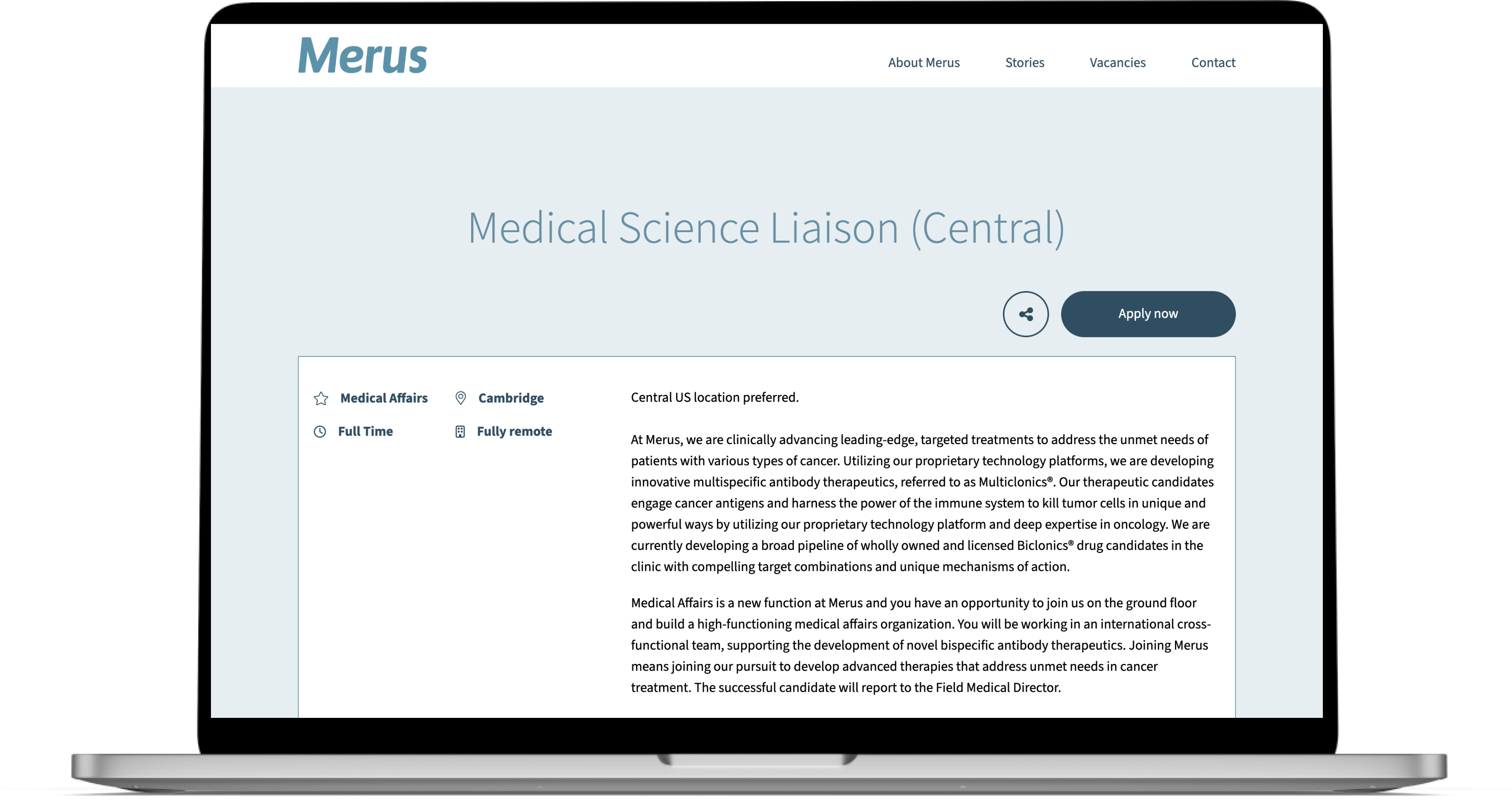 Merus is een biotechnologiebedrijf met een heldere missie: bijdragen aan nieuwe behandelingen in de strijd tegen kanker. Om die impact en het werkgeversmerk beter over te brengen, was er behoefte aan een werken-bij-site die kandidaten sneller door de funnel helpt. Een overzichtelijke, frisse omgeving waar vacatures en verhaal samenkomen.