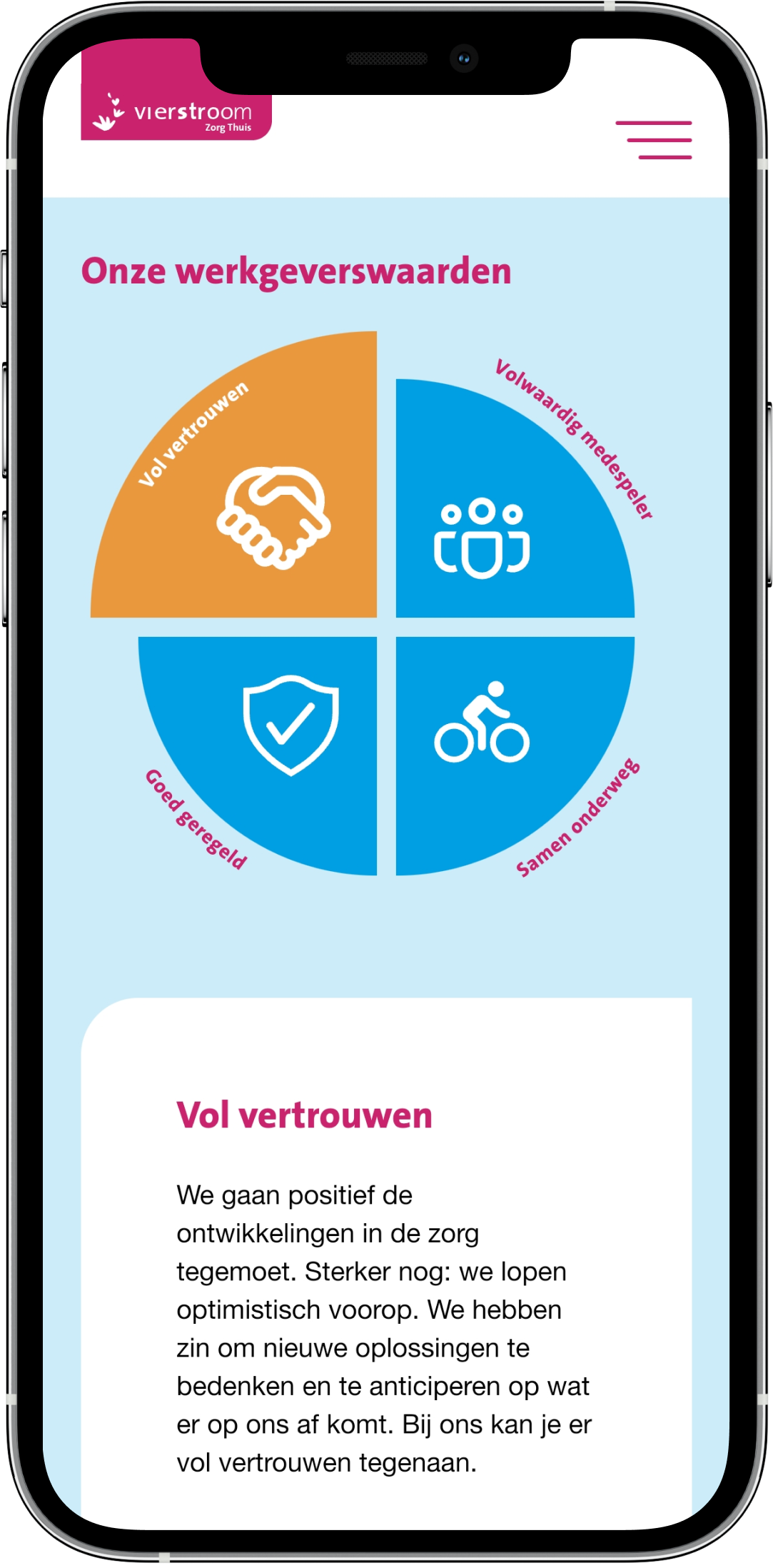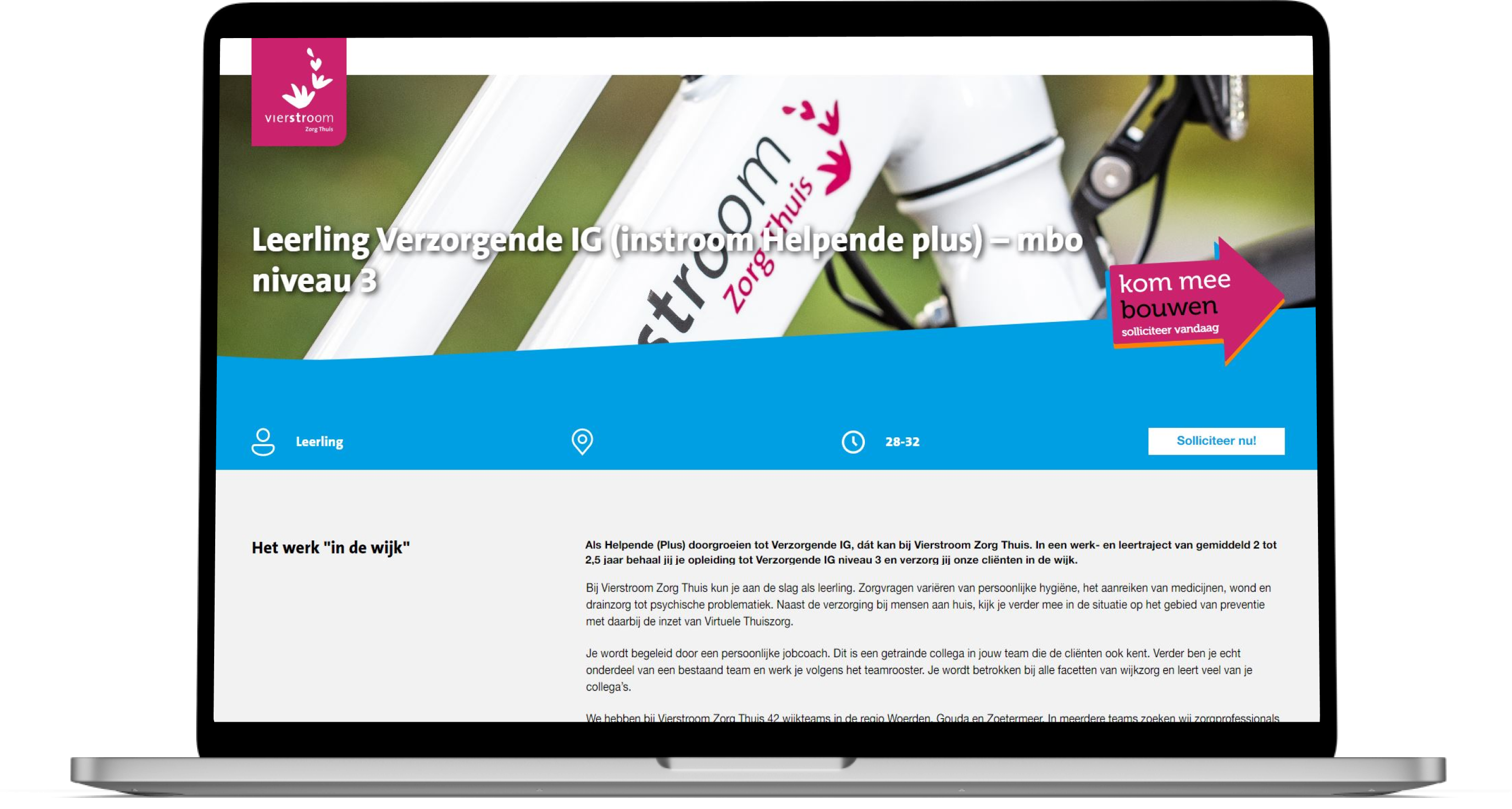 Door de grote tekorten aan zorgpersoneel wilde Vierstroom Zorg Thuis het werkgeversmerk sterker neerzetten en meer nieuwe collega’s aantrekken. In 2021 werd Vierstroom uitgeroepen tot ‘werkgever van het jaar’ en dat verhaal moest ook online voelbaar worden voor nieuwe medewerkers.