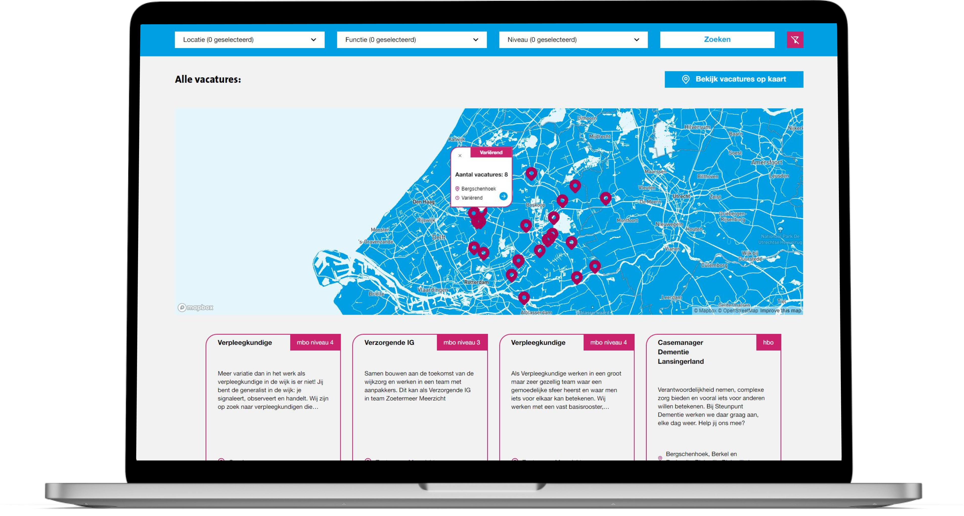 In de zorg zoeken kandidaten vaak gericht binnen hun eigen regio. Met slimme filters en een interactieve kaart zien bezoekers in één oogopslag waar de openstaande vacatures zijn en klikken ze direct door naar de juiste functie.