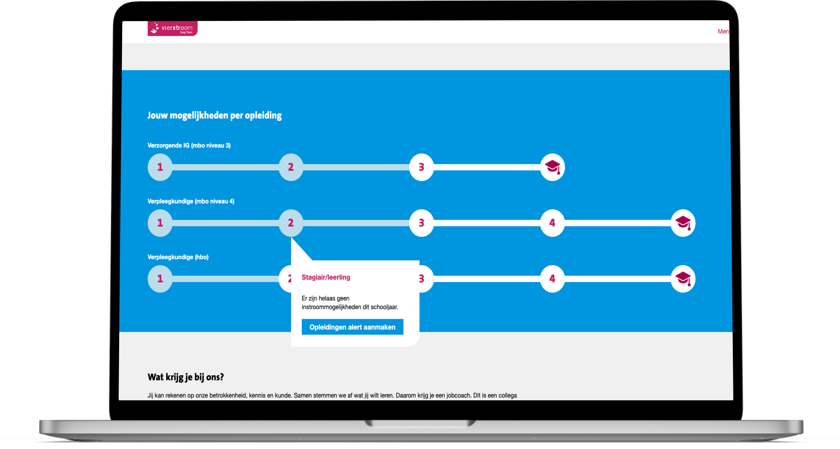 Daarnaast kunnen bezoekers zich aanmelden voor job- en stage alerts, zien ze visueel welke groeipaden er zijn binnen de opleidingen en is het mogelijk om eenvoudig een open sollicitatie te doen.